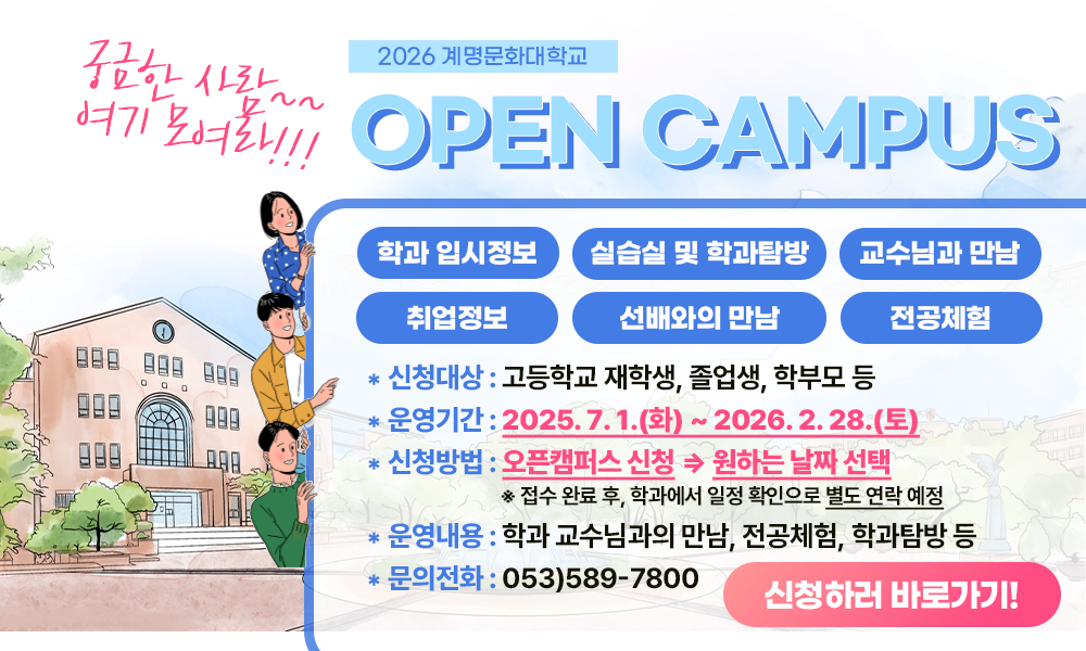 <박람회 정보> ◎ 박람회 명 : 2026학년도 대구·경북 전문대학 수시모집 입학정보 박람회 ◎ 참가대학 : 계명문화대학교 포함 대구·경북지역 19개 전문대학교 - 참가 대학명 가나다 순 : 가톨릭상지대학교, 경북과학대학교, 경북보건대학교, 경북전문대학교, 계명문화대학교, 구미대학교, 대경대학교, 대구공업대학교, 대구과학대학교, 대구보건대학교, 문경대학교, 선린대학교, 수성대학교, 안동과학대학교, 영남외국어대학교, 영남이공대학교, 영진전문대학교, 포항대학교, 호산대학교 ◎ 박람회 내용 1) 전공 및 진로 상담 2) 대학 소개 3) 수시모집 원서접수 ※ 특전 : 해당 박람회에서 ‘계명문화대학교’ 수시모집 1차 원서접수자 전형료 및 원서접수료 감면 ◎ 장소 : 대구상원고등학교 체육관(상원관) (대구 달서구 월배로 241) / 대구지하철 1호선 상인역 7번출구 도보 5분 거리 ◎ 일정 1) 2025.09.12.(금)(1일차) - 14:00 ~ 20:00 2) 2025.09.13.(토)(2일차) - 10:00 ~ 17:00 ◎ 박람회 안내 및 참가자 사전 등록 페이지 : https://2026ipsigo.kr ※ 해당 페이지에서 ‘대구·경북권 박람회 사전신청 바로가기’ 메뉴에서 신청 ◎ 주최·주관 : 한국전문대학교육협의회, 한국전문대학교무입학처장협의회, 한국전문대학입학관리자협의회 ◎ 후원 : 교육부 ◎ 문의 : 계명문화대학교 입학팀(053-589-7800)